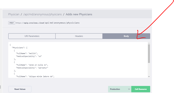 Modify the mock values to create a few new Physician, enter whatever names and specialisation that you prefer. When you are done, click “Call Resource“