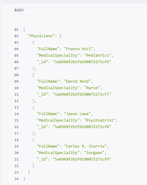 Let’s try to retrieve (GET) the list of physicians that we inserted earlier in this tutorial. Just try to remember the value that you entered as part of your x-app-key header and use it again… All your data should still be available.