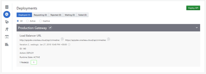 - Once you have selected your API Gateway to deploy your API into, click on Deploy. After a few seconds you should see that your API goes from status Waiting into Deployed.