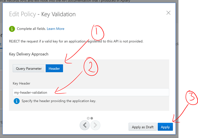 - Key Validation allows you to ensure that only API resources can be accessible to requests using authorised keys. This also ensures that such API consumption can be fully monitored and managed. For now, let’s add a new header-based key validation. In order to avoid clashing with the MedRec APIs, let’s called something like my-header-validation. When done, click on Apply.