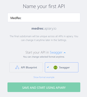 - You can create your first API Project, straightaway. Enter the name of your first API, in this case, we want to call it something like MedRec. Also make sure to click on Blueprint link below and select Swagger as the default API specification format to be used. Then, click on Save and Start Using Apiary.