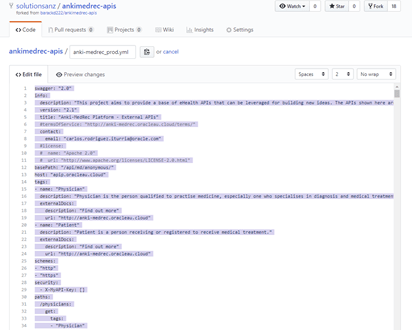 - If you decide to go to your forked repository on web, search for the API Swagger definition file named “anki-medrec_prod.yml” and click on it, so that you can copy its content.