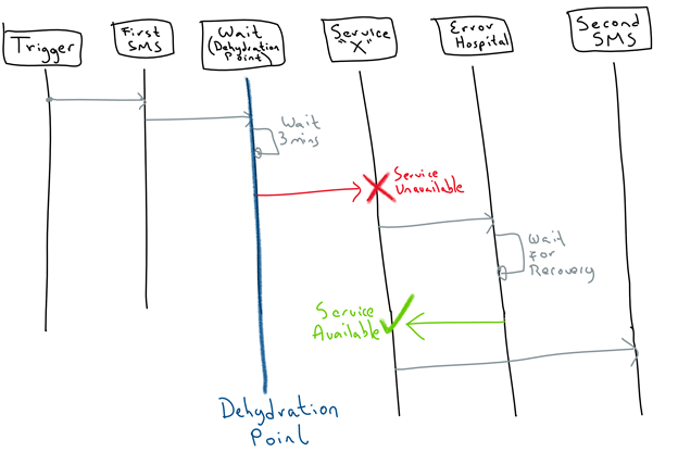 - Finally, add a second Invoke activity to the SMS service (or Logger), but this time say something like: “Hi, after dehydration point”.