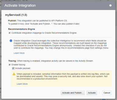 - Notice that your integration has not been deployed. For this click on the grey switch to the right. Tick the boxes to add tracing if you want and then click Deploy.