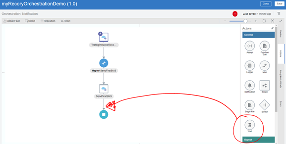 - Now, after sending the first SMS (or writing the first Logger), we are going to add a Wait Activity that will force our integration to dehydrate at runtime. Let’s say wait for 3 minutes.