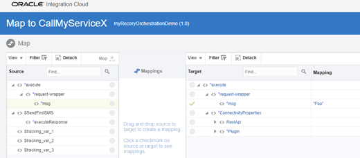 - Complete the new mapping for ServiceX. Set a hardcoded value or drag the left msg to right msg – It doesn’t matter what you set, we are not reading the variables anyway.
