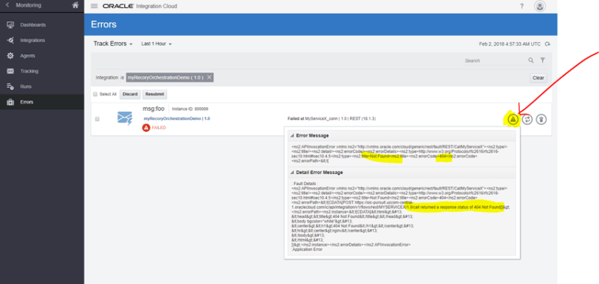 - We should see an error in the Oracle Integration Cloud – Error Hospital for this instance.