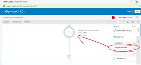- On the right menu, expand REST and select your just created Trigger REST connector. Then drag it into the beginning of the orchestration flow at the top.