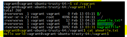 - Now, ssh into your VM and check under /vagrant directory – the file created in the Host machine (Windows in this case) is there.