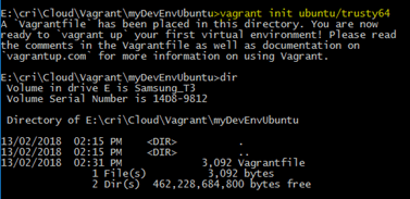 Initiate a new Vagrant configuration by typing “vagrant init” and the type of Box (VM) that you want to use.