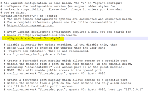 - Open it up and analyse its content. Notice the config.vm.box that is configured matches with the one that we selected when initiating the Vagrant file. Also scan through all the different settings that you can change.