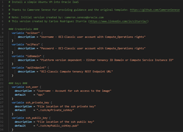 - The first section is the environment variables. We are going to use these ones to connect into our Oracle Public Cloud account.