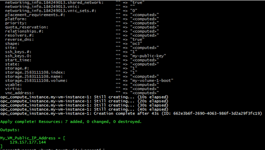 - Terraform is going to follow your plan and create your VM in the Oracle Public Cloud as indicated. After 1 or 2 minutes, the VM will be up and running.