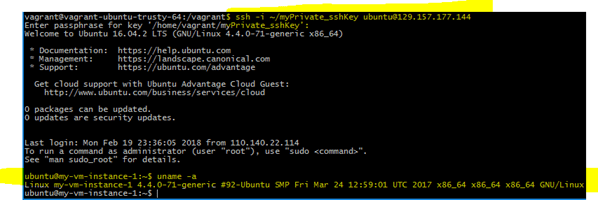 Within the Vagrant VM you can SSH directly. You will be using your Private Key to Connect, as the VM was automatically provisioned with your Public Key. Also, inbound SSH access will be already enabled, as defined in your Security Rule.