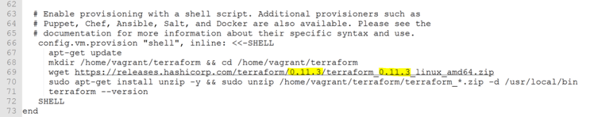 Once you run vagrant init [YOUR_BOX], open the Vagrantfile, so that we can add bootstrap instructions to also install Terraform.