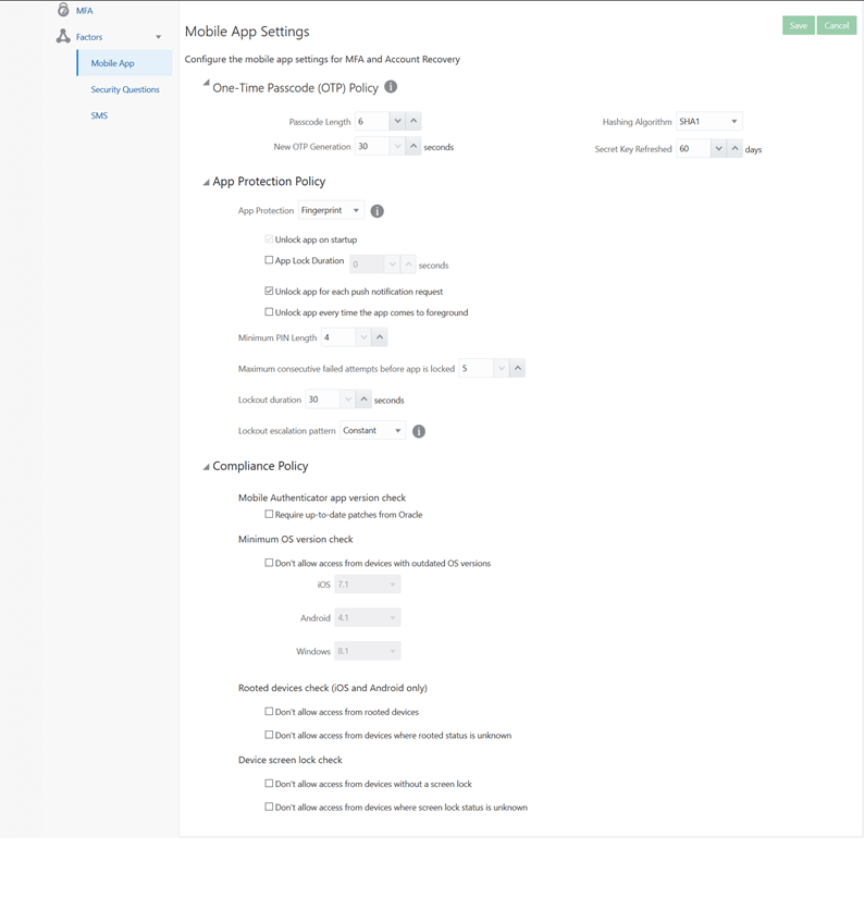 The final section on this screen covers compliance policies relating to the device. I can configure the App on the phone to ensure that all patches are up to date for the App as well as the OS on the smartphone. I can also prevent users from using the App on phones that have been rooted or don’t have screen locks. This greatly improves the security of the MFA application and if the MFA device should be trusted.