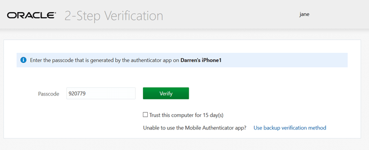 The Passcode appears as a number that changes every 30 seconds on the Mobile Authenticator App. After entering the Passcode and clicking on Verify button you will be redirected to the IDCS Self Service Console or any other application that you have protected with IDCS.