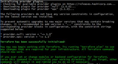 Once you feel comfortable with your settings, go to the top provisionAPIPlatform directory and run terraform init to download and configure the providers being used i.e. opc and null: