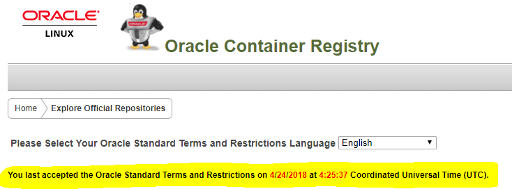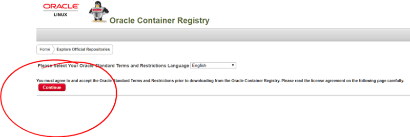 - You have an existing Oracle Container Registry account. Then, sign in to Oracle Container Registry and accept the Oracle Standard T&Cs for the Oracle Container Registry.