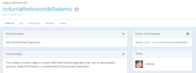 Now that we have created our Docker image and that we have briefly tested it. Let’s proceed to push it into a Docker Hub repository. For this, I assume that you already have a Docker Hub account and that you have created a repository. For example, I created one called: helloworldk8sdemo – Notice that Docker Hub repos are always prefixed with your Docker Hub username, so you might choose the same name if you like.