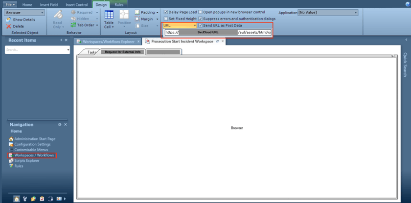 Create a [Tab] and then add a [Browser Control]. Insert the URL of StartForm.html into the URL field. Do the same for TaskList. Make sure to set “Send URL as Post Data”.
