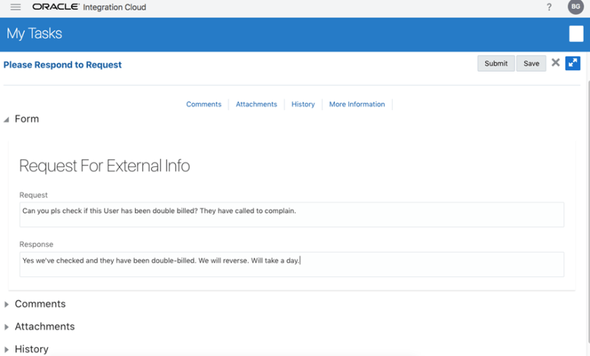 2. Trigger an external user that only has access to Process Cloud to submit a response to the query.