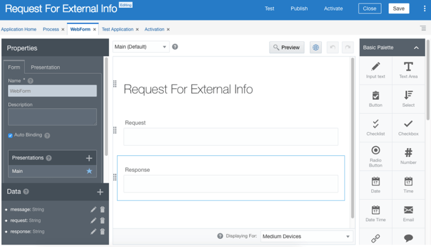 Modify the UI with fields [Request] and [Response]. Once done Publish and Activate the process.