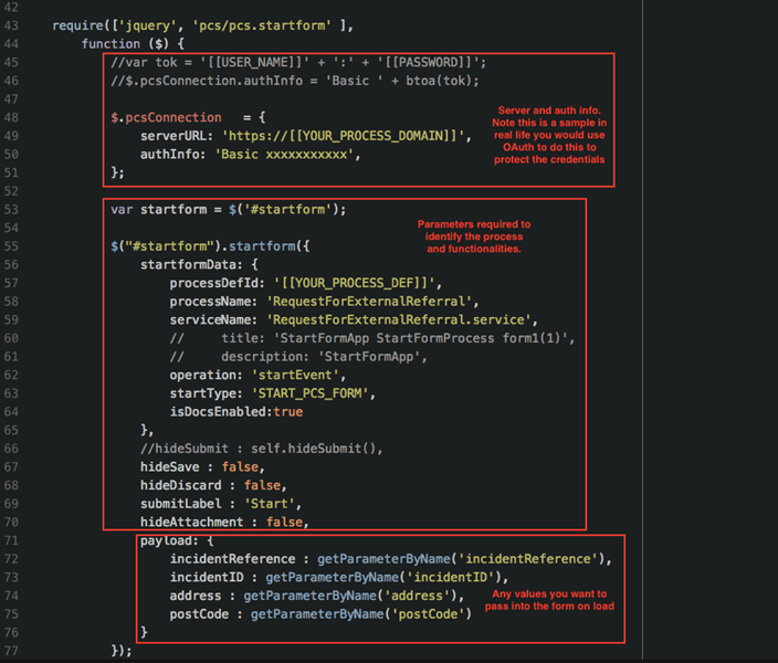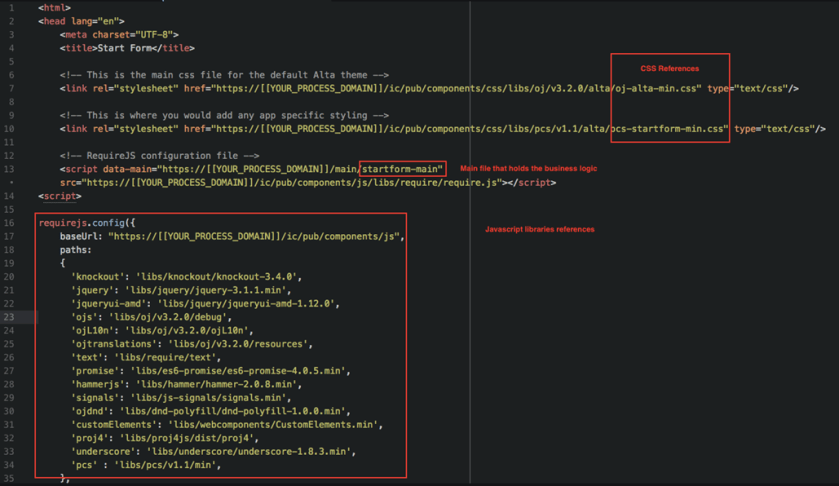 You will create a HTML5 page that uses RequireJS and Oracle JET to surface this client-side UI. You do not need to download the libraries locally as they are hosted by the Process instance and you can host it in any HTML server e.g. Apache, Node, Tomcat, WebLogic. I’m using Node serve on my local machine for testing purpose after which I’m hosting it directly in Service Cloud.