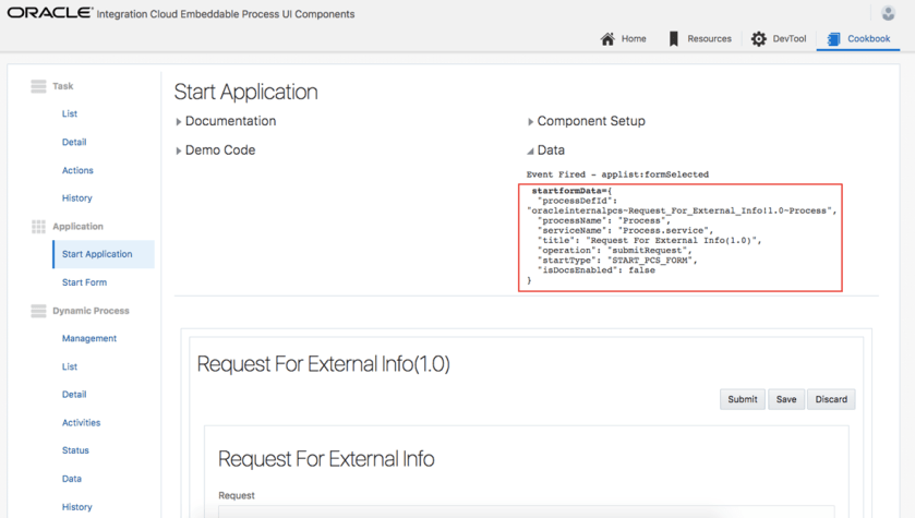 To ensure you get the right values to kick start the process. Navigate to [Start Application] in the cookbook. Kick-off your relevant process and then look at the payload values.