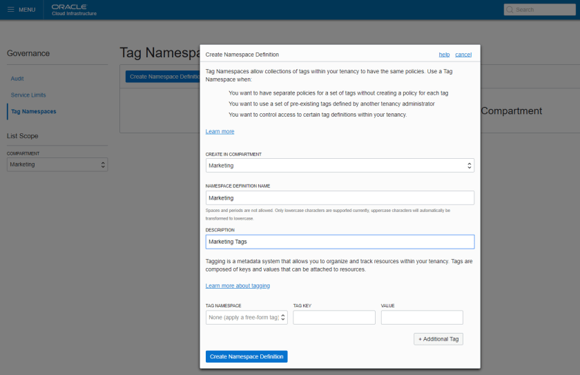 Click on Menu -> Governance -> Tag Namespaces -> Create Namespace Definition
