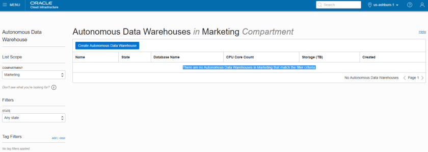 We should see a different message now: “There are no Autonomous Data Warehouses in Marketing that match the filter criteria.”
