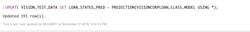 UPDATE LOAN_TEST_DATA SET LOAN_ELIGIBILITY_PRED1 = PREDICTION(LOAN_CLASS_MODEL USING *);