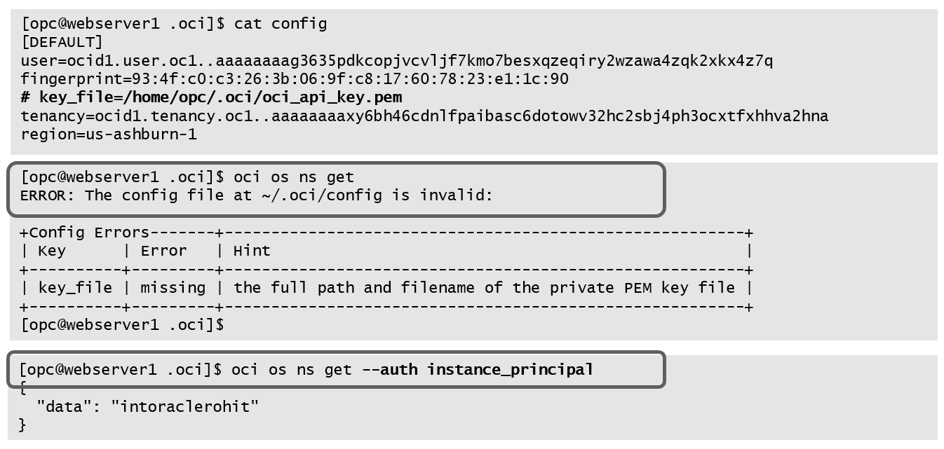 Step 3: Customer deploys code to an instance. OCI SDK/CLI is able to make calls to OCI APIs without customer configured credentials. Following figure 3 depicts the screenshots for the same: