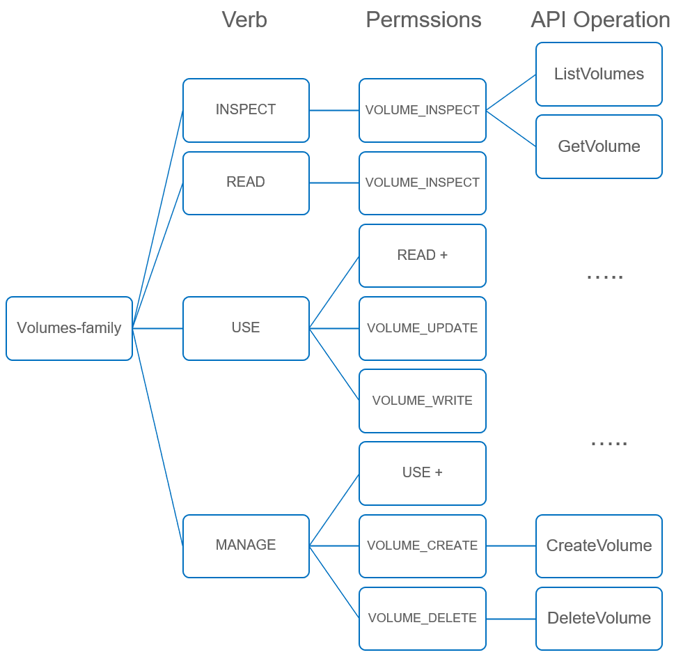 The following figure 6 provides depicts the Verbs and Permissions for the Volume family:
