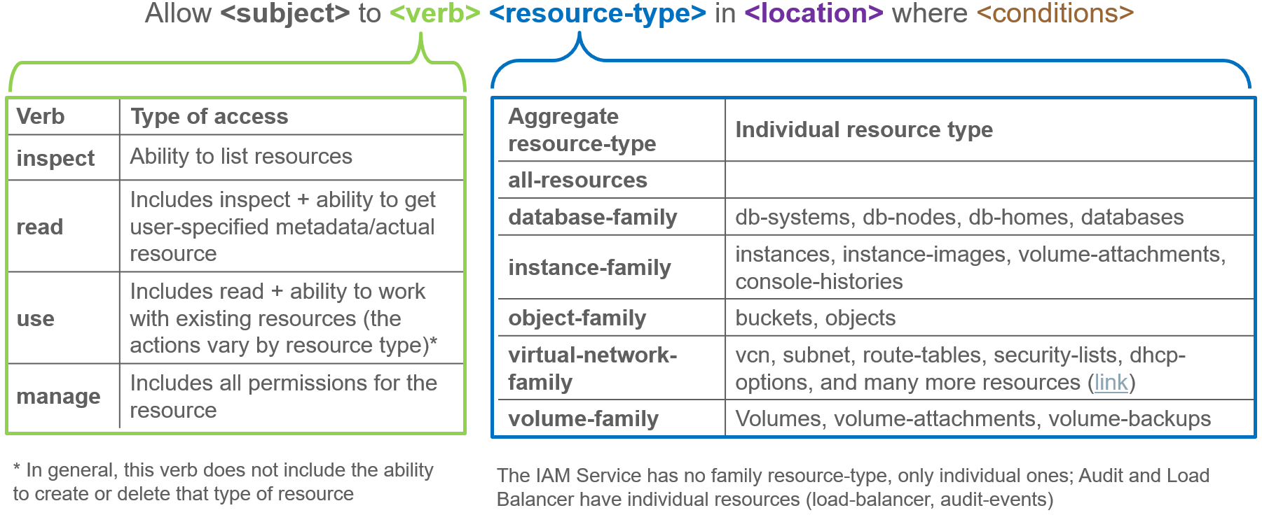 • Allow group <group_name> to <verb> <resource-type> in tenancy