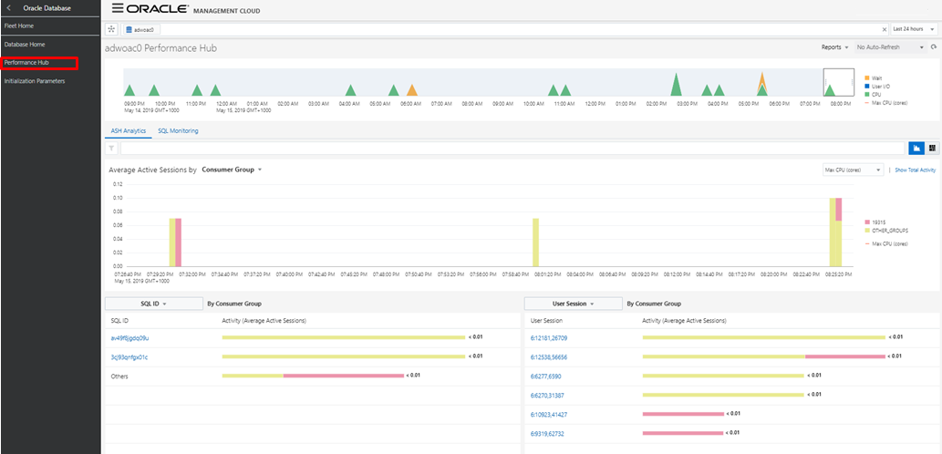Performance Hub page provides a current and historical view of Active Sessions and SQL IDs.