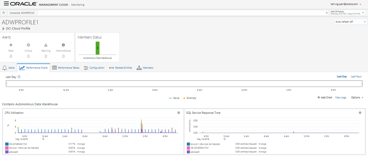 - Click on the Performance Charts tab to see the resource metrics collected for the ADW instance.