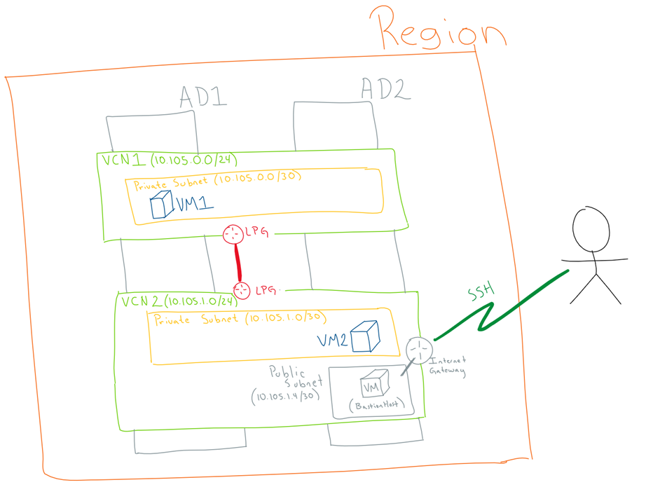 - Configure 2 private VMs, each in a different VCNs (different AD)