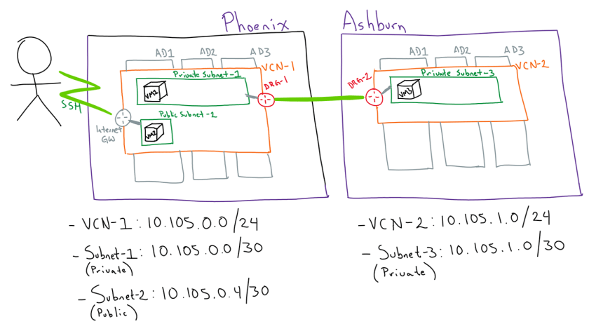 For this demo, we are going to connect workloads between Phoenix and Ashburn. Each region will have its own VCN and within each VCN we are going to deploy a private subnet with 1 Linux VM, used to test the inter-communication across the regions.