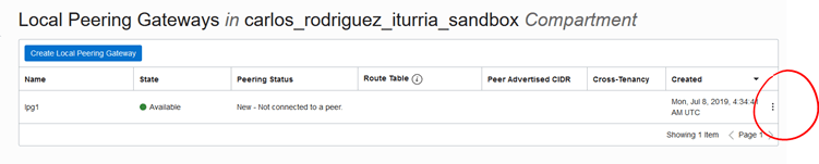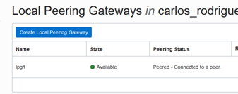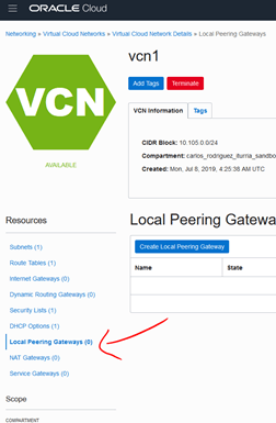 - Go to your VCN1 and under Resources click on Local Peering Gateway