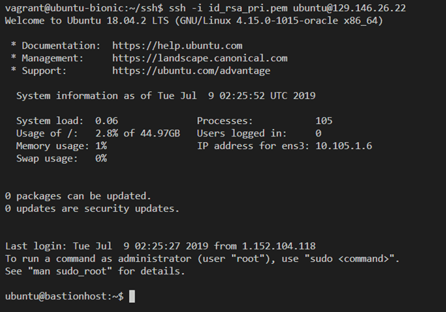 - Use public bastion host to connect to 1 of the private VMs and then confirm connectivity into the other private VM.