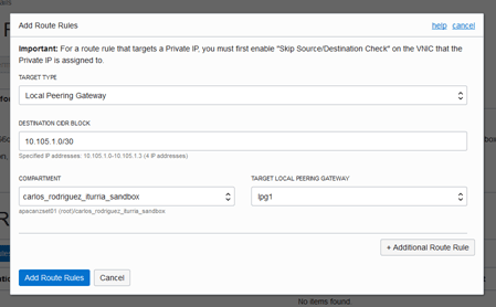- Now repeat the previous steps to add a Route Rule from Private Subnet 2 (VCN2) to route all 10.105.0.0/30 traffic over lpg2.