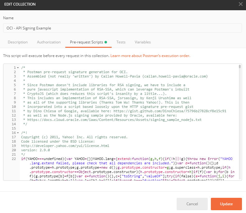 The script used is then in the Pre-request Script tab. The comments there explain what is going on, but the high level summary is that since Postman doesn’t have many internal libraries, the script has to inline a minified implementation of RSA-SSA, which is the signing algorithm required by OCI. The actual script itself is not-minified for clarity and transparency and begins on line 52.