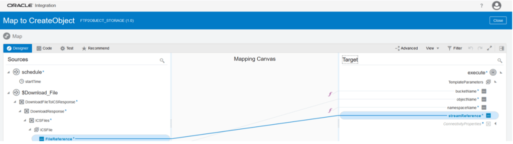 Next, OIC gives us the ability to grab the file reference from the output of the Download File operation and map it to the Stream Reference required by the OCI Object Storage API.