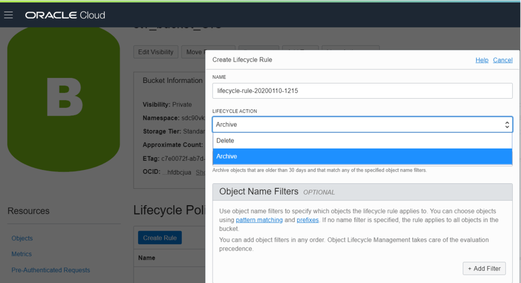 Now that we have discussed how to write files to OCI Object Storage with Oracle Integration Cloud, I believe that we should also quickly address the ability to enforce an archival policy on these files. Implementing an archival process on files at rest, is a common request and is really easy to achieve with OCI Object Storage as it comes with easy to configure lifecycle policies. These policies let you archive or delete files based on the age of the file and its associated pattern. This means that we can quickly setup an archival policy on objects that exist in a certain bucket, begin with a certain prefix or have a given pattern or extension such as .csv.