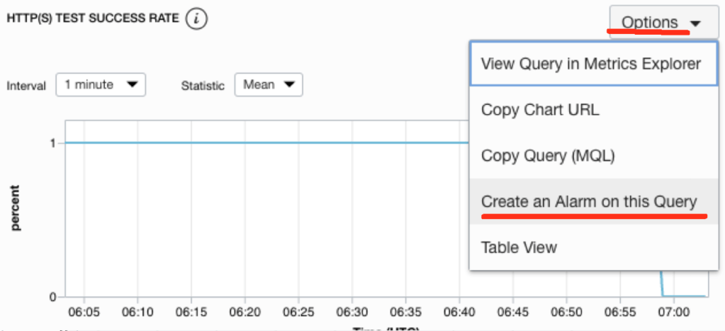 There are several metrics available from OCI Health Check but I’ll use the metrics for HTTP(S) TEST SUCCESS RATE as below, to check my OIC instance availability. It comes with 100% or one for success and zero for failure.