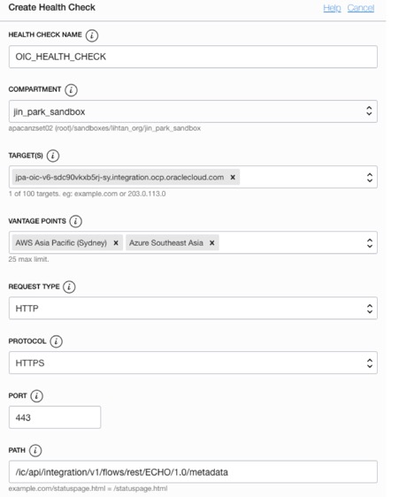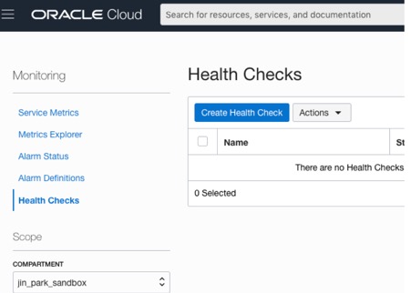 Let me start with OCI Health Checks setup by click “Create Health Check” button. It is available under Monitoring menu of OCI console as below. I’m doing this from my sandbox compartment. Compartment is very important construct from OCI, make sure you know what it does (https://www.ateam-oracle.com/oracle-cloud-infrastructure-compartments). Also I double checked that I had right OCI Policies added for reading metrics from my compartment (https://docs.cloud.oracle.com/en-us/iaas/Content/Identity/Concepts/commonpolicies.htm#metrics-access).