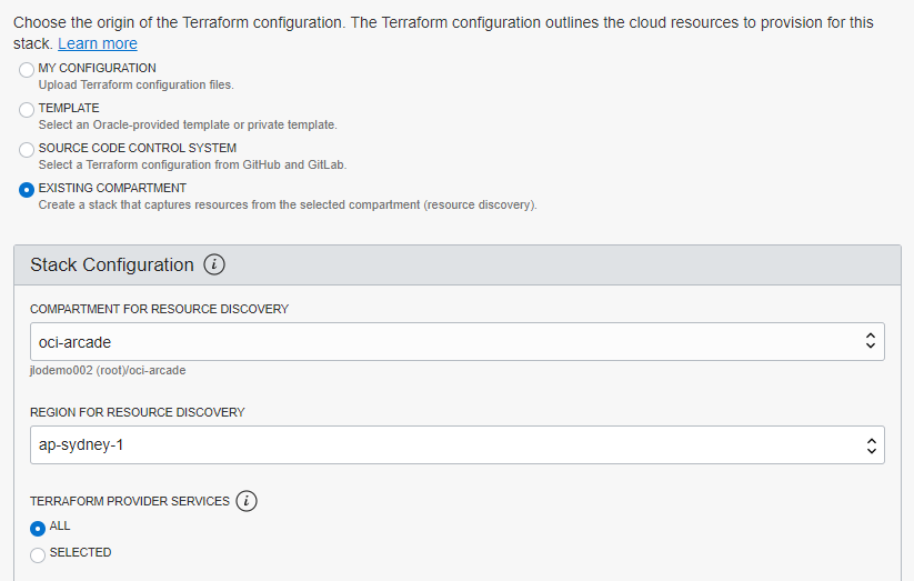 By creating a stack, there are different options here in terms of the source of the stack however in this scenario, I’m selecting the option of “Existing Compartment” so I can introspect that compartment to create a stack. There’s a couple of additional options as to the region and compartment and maybe a set or subset of OCI resources to include in the stack. For what I did, I just said all.