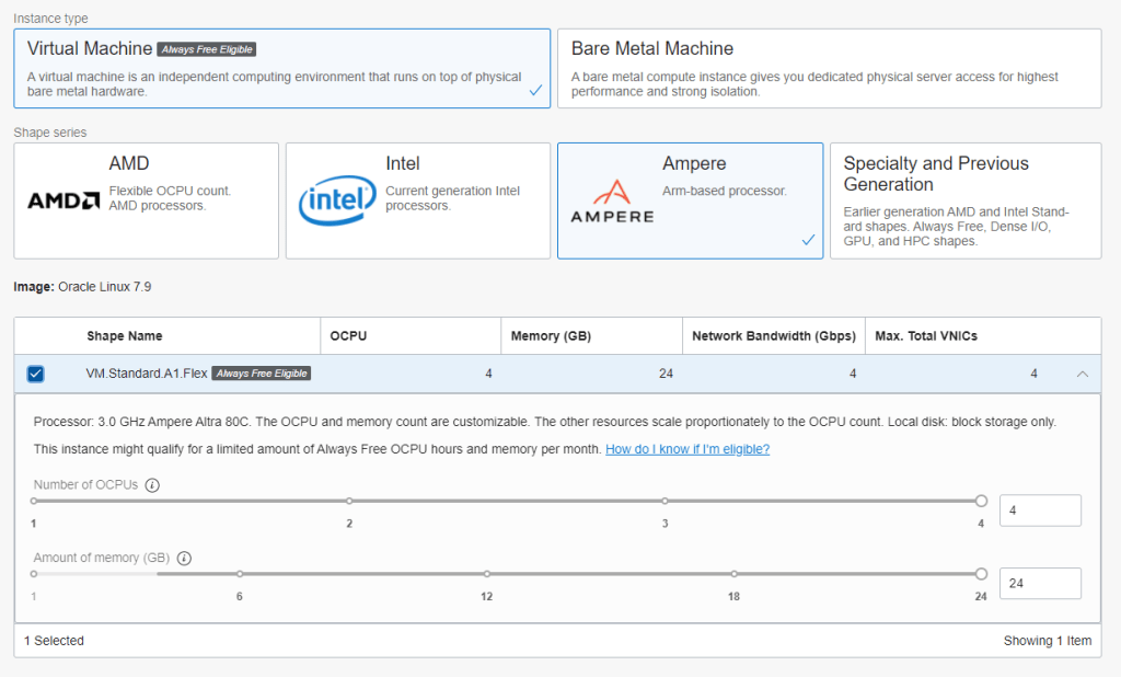 I was excited to work with the new VM.Standard.A1.Flex Compute Shape. The nice thing is that the OCI Always Free Tier allows up to 4 OCPUs and 24 GB of RAM to be provisioned of this shape.