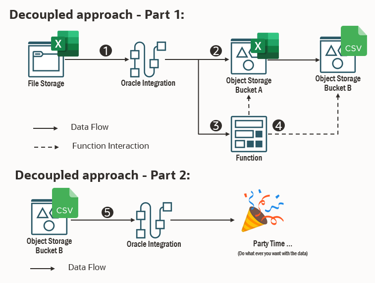 The second approach, depicted above is quite obvious, all we are doing here is separating the file conversion process from the file processing operation via two integrations. The second integration can be either scheduled or driven by the OCI Event service (see here). The description of the required steps are the same so i wont re-iterate them here.